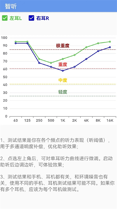 支持【听力测试】和【分频段多通道响度补偿】,让你随时了解自己的听力状况,并获得个人专属的声音效果!必要时海可以把医院测得的听力图录入到智听里面。